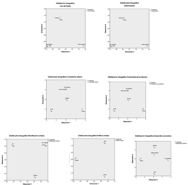 Así mismo, el análisis geográfico permitió detectar la distribución con relación a los factores que influyen en la expansión urbana, el cual está representado por el siguiente orden de importancia frente al factor de uso del suelo: un 56 % corresponde a Asia, un 17 % a África, un 17 % a Europa, un 6 % a Suramérica y un 3 % a Norteamérica.