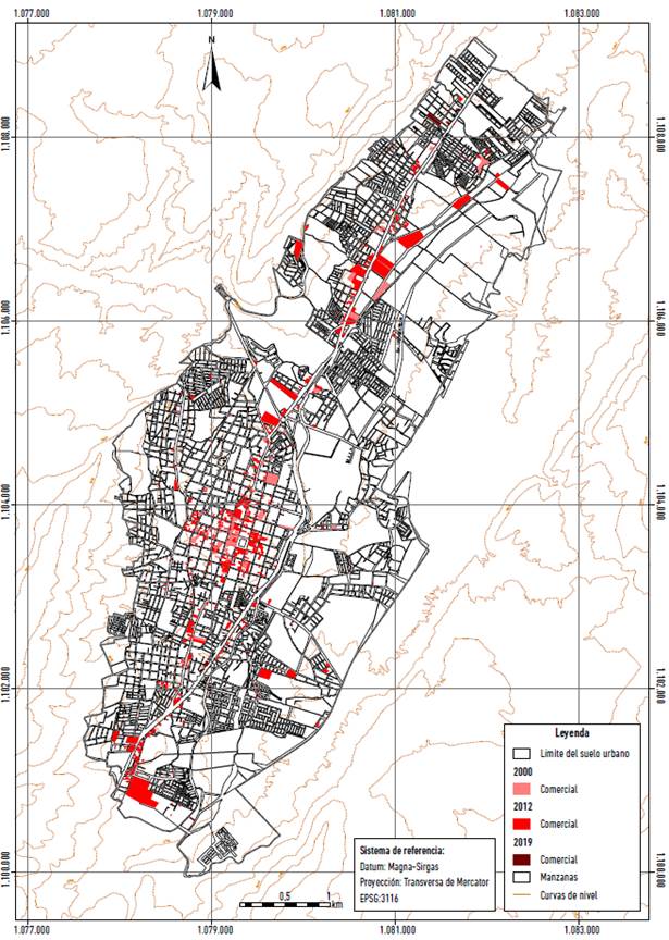 Figura 7: Crecimiento del uso comercial 2000, 2012 y 2019.