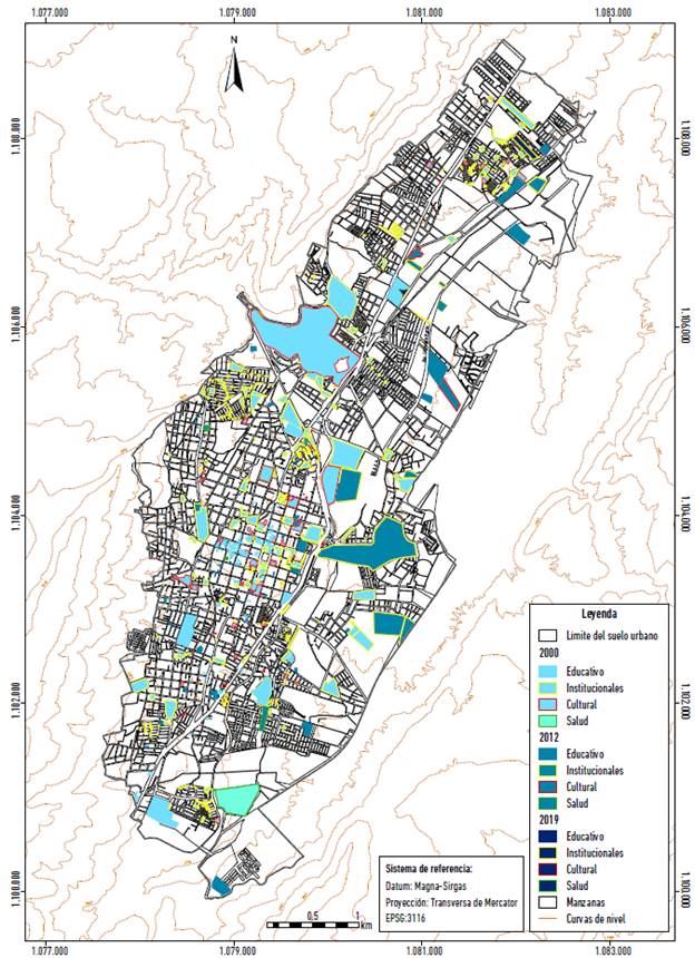 El último uso por revisar corresponde a los equipamientos (Figura 9), los cuales también presentan una organización de aparición más reciente en las periferias de la ciudad en el periodo de estudio, con un énfasis en el borde oriental de la ciudad. Un fenómeno marcado es la consolidación de equipamientos culturales en el centro histórico.