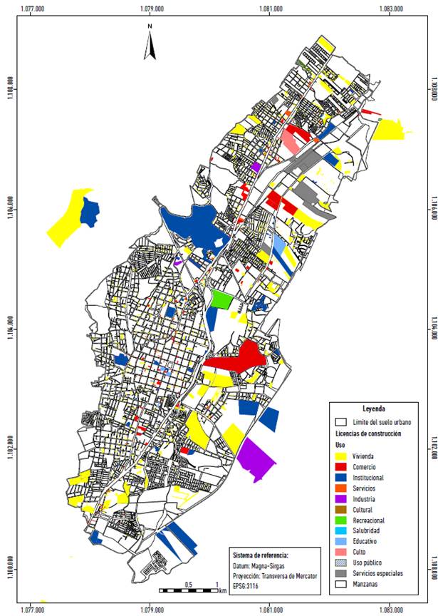 Los atributos con que se contaba en dichas bases, se refieren al avalúo catastral, el destino catastral y la altura de las edificaciones, principalmente. Por otro lado, también se contó con información cartográfica suministrada por la Secretaría de Planeación Municipal, en la cual se resalta un registro de las licencias de construcción emitidas entre 2012 y 2016, cubriendo parcialmente el periodo de estudio. Con esta información, se procedió a identificar algunas características en la evolución urbana del municipio, con la finalidad de reforzar el análisis a la política pública, en cuanto a la concreción en la realidad urbana.