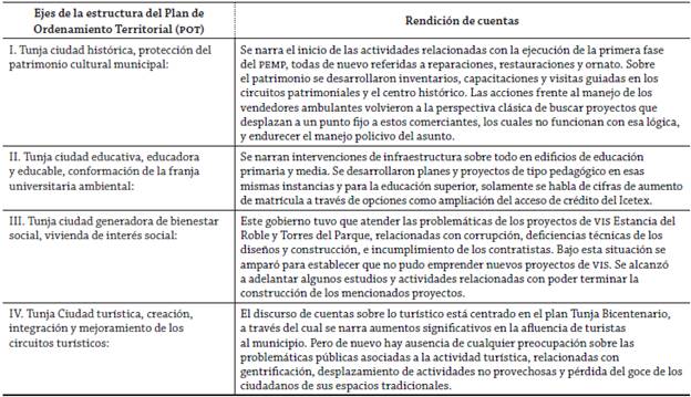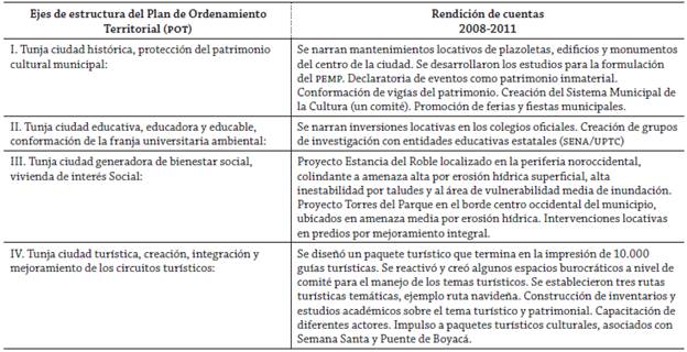 En el primer eje, los avances denotan acciones, por un lado, superficiales de embellecimiento de los bienes de interés cultural, de los espacios públicos asociados a ellos, y por otro, la consolidación de una incipiente estructura burocrática que sesione sobre la problemática, sumado al trabajo sobre las declaratorias de patrimonio inmaterial (Alcaldía Mayor de Tunja 2012). No es posible dar cuenta en el contenido de la rendición de cuentas de ninguna acción que propenda por proteger los derechos de los ciudadanos más vulnerables que residen en el área del Centro Histórico, ante los fuertes fenómenos de gentrificación y de desplazamiento de actividades informales y no deseadas para el nuevo centro turístico que se espera conformar; en este sentido es que los principios fundamentales del OT de equidad y justicia social y espacial quedan relegados, y finalmente la inversión estatal solo garantizará embellecer un espacio y eliminar lo que obstaculice la mercantilización turística, cultural e inmobiliaria de este patrimonio de los tunjanos.