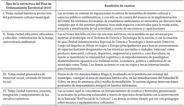 El POT plantea la necesidad de posicionar a Tunja como un municipio cultural, en donde los elementos que tienen directa relación con la narrativa de organización del espacio urbano son dos: primero el diseño, la ejecución y el desarrollo del modelo de uso del suelo contenido en el POT, y segundo, la ejecución de proyectos y obras de infraestructura.