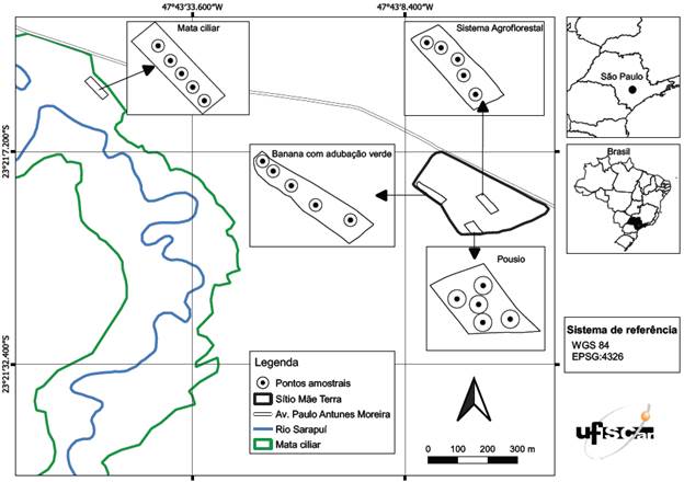 No sítio Mãe Terra, foram amostrados solos em três diferentes usos, e próximo ao sítio amostrou-se em área de preservação permanente (App) do rio Sarapuí, pertencente à bacia hidrográfica do rio Sorocaba conforme o mapa da Figura 1.