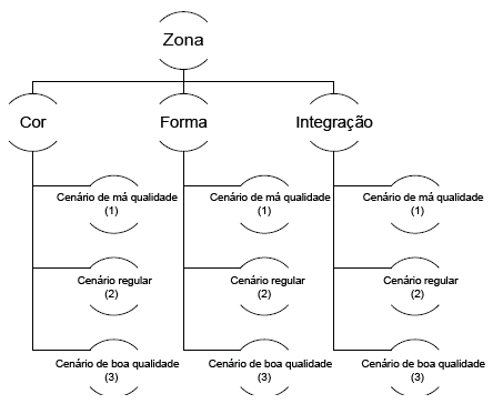 Cada um dos atributos analisados nas zonas resultou em uma nota de 1 a 3, sendo 1 para condição não ideal, 2 com condição regular e 3 para condição ideal, conforme exemplificado no esquema da Figura 2.