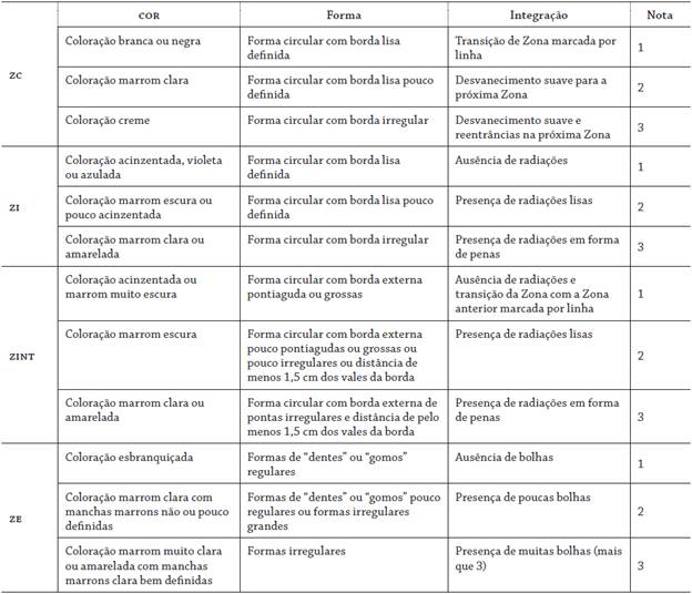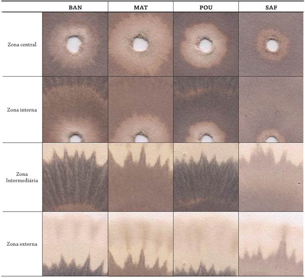 Considerando esses mesmos aspectos os croma-togramas foram quantificados por meio da chave de interpretação proposta por Siqueira (2018), considerando atributos relacionados as características de cor, forma e integração para cada uma das quatro zonas reveladas nos papéis circulares (central, interna, intermediária e externa) conforme descrito na Tabela 1.