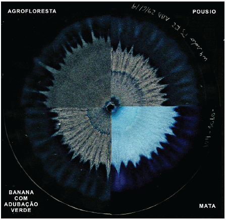 As características visuais das zonas intermediárias e externas indicam as condições de presença da matéria orgânica, a ação dos microrganismos e a atividade enzimática na análise de CCP. No sistema agroflorestal a zona intermediária apresentou integração com as demais zonas, com terminações irregulares, caracterizando assim presença de matéria orgânica na forma de húmus. Houve ainda a formação de dentes e terminações que se iniciam desde a zona intermediária que seguiram até a zona externa. Este tipo de padrão visual significa estoque de matéria orgânica no solo em forma de húmus com intensa atividade microbiológica (Restrepo e Pinheiro 2011). Na área da banana nota-se que a zona intermediária apresentou radiação em formas de flechas, com terminações pontiagudas que pouco se conectam com a zona seguinte, que se revelou na imagem com tamanho grande e com desenhos mais achatados, poucas nuvens e poucas manchas, o que indica pouco acúmulo de húmus. Na área da mata a zona intermediária apresentou terminações irregulares com presença de radiação em formas de penas, sendo possível a observação de manchas que indicam o acúmulo de húmus em praticamente todos os pontos de conexão com a zona externa, o que evidencia forte atividade biológica e enzimática em cooperação com o processo de decomposição da matéria orgânica (Restrepo e Pinheiro 2011). Na área do pousio a zona intermediária revelou forte radiação em forma de flechas com terminações curtas que não se conectam diretamente com a zona externa, o que indica pouco acúmulo de húmus e baixa atividade microbiológica.