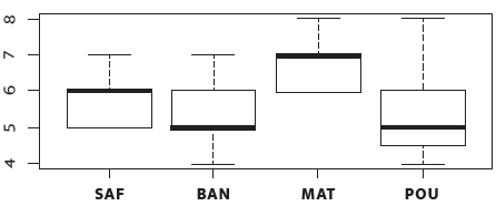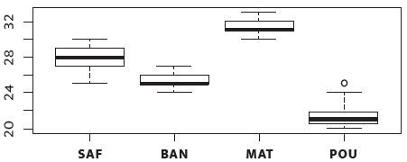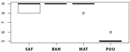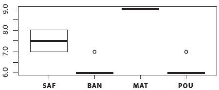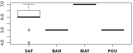 Especificando a avaliação dos resultados através da avaliação pela chave de interpretação, conclui-se que o único uso que teve valores baixos na zona central foi o pousio, em razão da forma circular com borda lisa definida e da ausência de integração com a zona interna. Reflete-se que caso o critério de avaliação considerasse o tamanho da zona, os cromatogramas do sistema agroflorestal teriam tido valores menores na zona central. Para a zona interna, a mata se destacou acima dos outros usos, por apresentar coloração marrom, com forma circular irregular e presença de radiações em forma de penas. Na zona intermediária, a mata também se destacou por apresentar forma circular com borda externa de pontas irregulares e distância de pelo menos 1,5 cm dos vales da borda e por apresentar radiação em forma de penas, enquanto as áreas de banana e de pousio apresentaram forma circular com borda externa pontiaguda, cenário que aponta má condição para esta zona. Para a zona externa, as variações ocorreram em razão da coloração marrom muito clara ou amarelada com manchas marrom claro bem definidas e das variações das formas irregulares que surgiram nas áreas de mata e do sistema agroflorestal. A presença de bolhas conforme às apresentadas nas imagens de referências presentes na chave de interpretação não foram notadas na zona externa em nenhum dos cromatogramas, o que não permitiu nota máxima (9) para nenhum dos usos nessa zona, já que para esse atributo todos os sistemas pontuaram 1. Os box plots (Figuras 7, 8, 9, 10 e 11) apresentam as variações de valores máximos, mínimos e de média dos valores totais para cada sistema analisado e para cada uma das zonas.