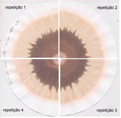 Os cromatogramas foram interpretados qualitativamente a partir de padrões vinculados aos indicadores da saúde do solo. O cromatograma é uma imagem formada em um papel de filtro circular, onde a solução de solo se distribui por capilaridade formando zonas. Estas zonas se vinculam aos indicadores de qualidade. A zona central indica a condição de aeração; a zona interna, a condição nutricional; a zona intermediária avalia aspectos relacionados à matéria orgânica; e a zona externa, às enzimas e aos microrganismos do solo. O cromatograma com as características reveladoras de um solo saudável apresenta a zona central com a coloração creme integrada ininterruptamente à zona interna, indicando desta forma boa aeração e estrutura. Se a ligação gradual se mantém entre a zona interna e a zona intermediária, pode-se afirmar a presença de atividade biológica benéfica associada à matéria orgânica. Por fim, se a integração permanece com a zona externa formando nuvens ou ondas, com os caminhos em formato de penas desde a zona interna se encerrando nas bordas do croma, indica-se que a microbiologia do solo, a matéria orgânica e os nutrientes encontram-se em bons estados e o solo em questão é saudável e propício para produção sustentável de alimentos (Restrepo e Pinheiro 2011).