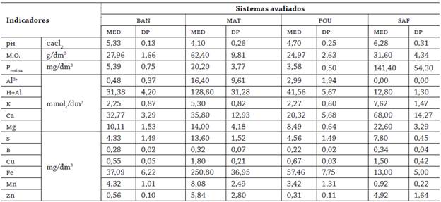 Nota: BAN (banana com adubação verde), MAT (mata ciliar), Pou (pousio), SAF (sistema agroflorestal), MED (média), DP (desvio padrão).
