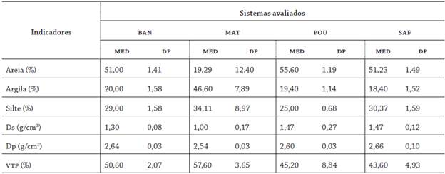 Nota: BAN (banana com adubação verde), MAT (mata ciliar), pou (pousio), SAF (sistema agroflorestal), MED (média), DP (desvio padrão), DS (densidade do solo), DP (densidade da partícula) e VTP (Volume total de poros).