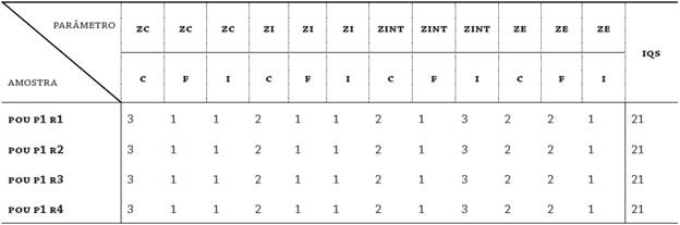 Nota: ZC (zona central), zi (zona interna), ZINT (zona intermediária), ZE (zona externa), C (cor), F (forma), I (integração), P1 (ponto 1), R (repetição) e IQS (índice de qualidade do solo).