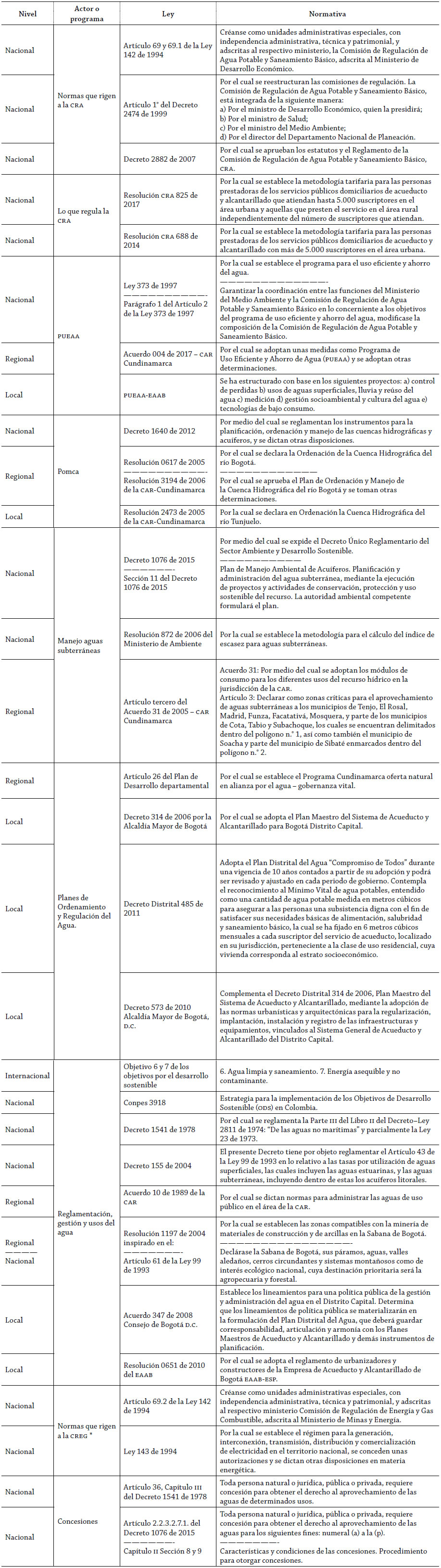 Del mismo modo, surgieron normativas de orden regional y local en Cundinamarca y el Distrito Capital para la regulación del agua y su consumo con base en las particularidades de cada actor y zona. Lo anterior se materializó en planes como: "Cundinamarca oferta natural en alianza por el agua - Gobernanza vital"; el "Plan Maestro del Sistema de Acueducto y Alcantarillado" (Decreto 314 de 2006 por la Alcaldía Mayor de Bogotá) ejecutado por la EAB-ESP; el "Plan Distrital del Agua" (Decreto Distrital 485 de 2011). También se reseñan las normativas destinadas a usos particulares del agua como la minería (Resolución 1197 de 2004 del Ministerio de Ambiente y Desarrollo Sostenible) y la asociada a proyectos urbanísticos (Resolución 0651 de 2010 de la EAAB y Decreto 573 de 2010 Alcaldía Mayor de Bogotá, D.C.).