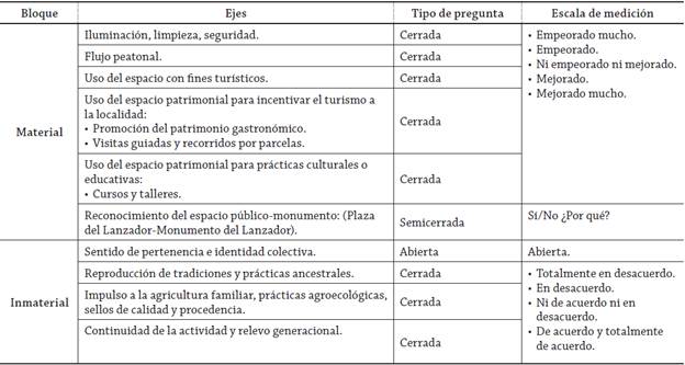 El cuestionario estuvo conformado por veinte reactivos y dividido en tres grandes secciones, en las cuales se incluyeron cuestionamientos en cuanto a las generalidades de los actores, su actividad, vinculación con el mercado y con los consumidores (bloque 1). Así mismo, el segundo y tercer bloques estuvieron enfocados en conocer su percepción en torno al papel que el mercado tiene, y la activad que ellos mismos realizan, en la gestión colectiva y conservación del patrimonio alimentario, material (bloque 2) e inmaterial (bloque 3).