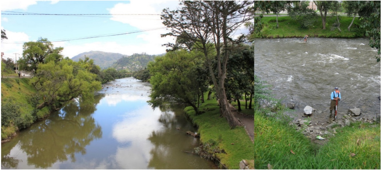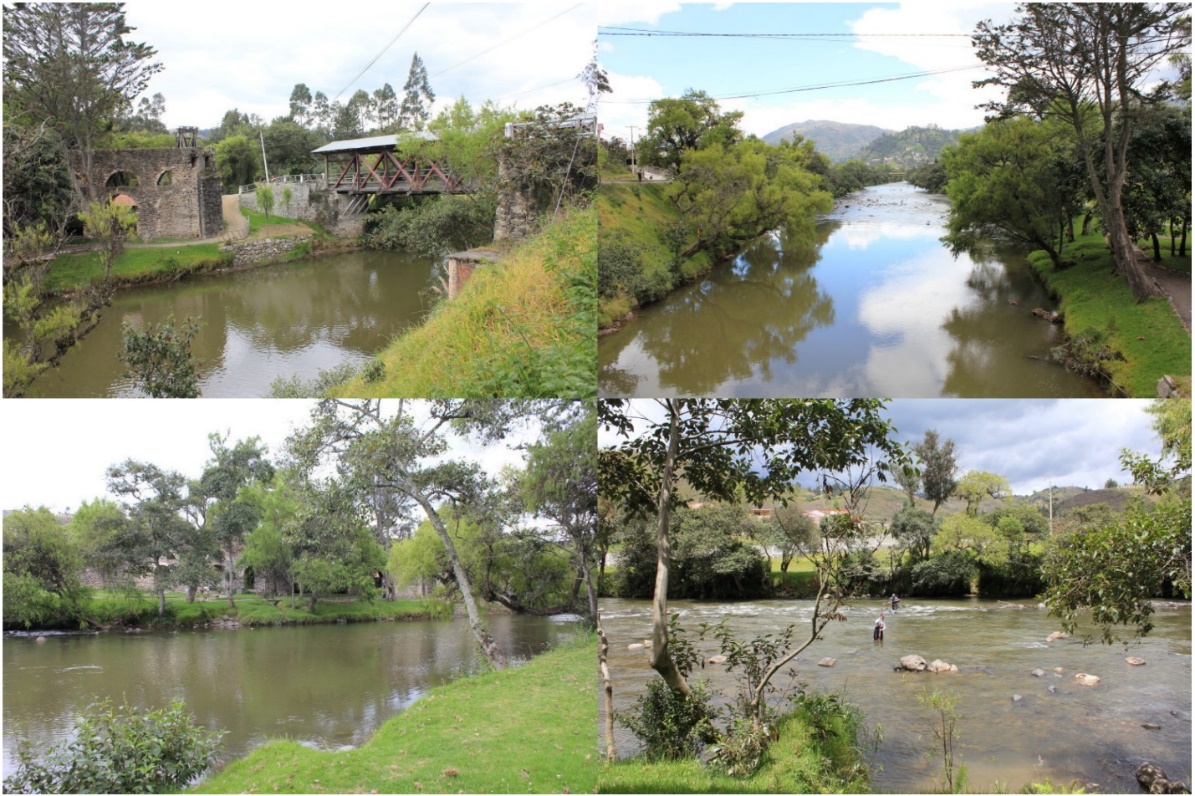 La zona de estudio (Figura 1) comprende un tramo de aproximadamente cinco kilómetros del río Santa Bárbara, que fluye a través del centro de la ciudad de Gualaceo en el sur de Ecuador. Este río de montaña se encuentra en la región Centro-Este de la provincia de Azuay y pertenece a la cuenca del río Paute, que genera aproximadamente el 50 % de la demanda de energía eléctrica en Ecuador (Yadaicela 2012). Existen tres puentes a lo largo del tramo, ubicados en las abscisas de 822 m (P1: Chacapamba), 1.386 m (P2: Jaime Roldós) y 2.544 m (P3: Velazco Ibarra), respectivamente. El sitio tiene una altitud de 2.230 m.s.n.m. (Campozano et ál. 2016), y una temperatura media anual de 14 ºC (Mora y Willems 2011). El régimen de precipitación es bimodal, y la precipitación anual promedio es de 820 mm (Campozano et ál. 2016), lo cual es característico del régimen interandino (Ochoa et ál. 2015). Históricamente, las crecidas han provocado el desbordamiento del río y esto ha afectado fuertemente al área urbana de la ciudad de Gualaceo, con una recurrencia promedio de dos a cuatro años (SENAGUA 2014). Por ejemplo, inundaciones históricas ocurrieron en junio de 2007, abril y julio de 2011, julio de 2013 y julio de 2017.