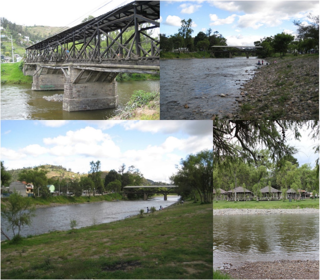 : Sitio de estudio del tramo del río Santa Bárbara y ubicación de los puentes.