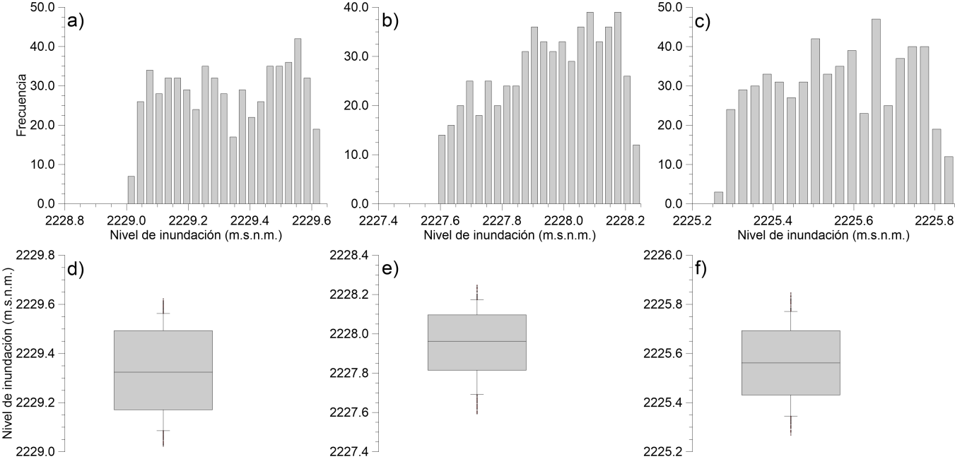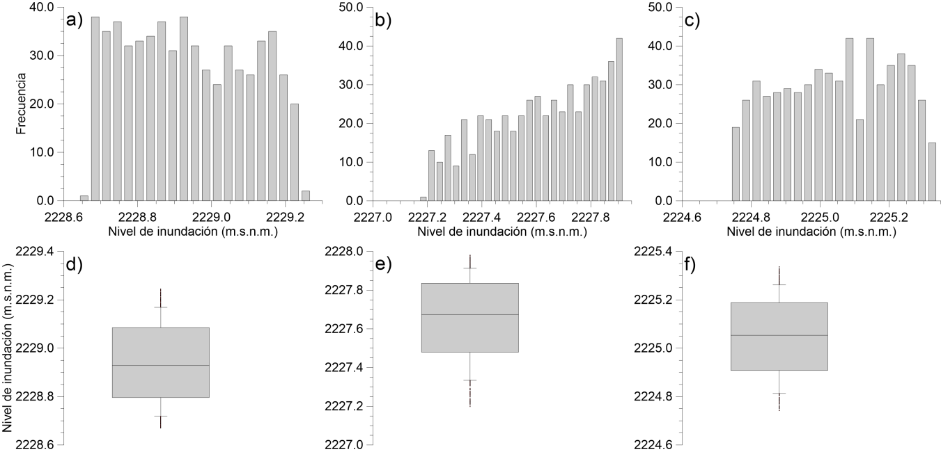 Los resultados de las seiscientas simulaciones de MC muestran que los niveles de inundación no se distribuyen normalmente, como lo confirman tres pruebas de normalidad: Shapiro-Wilk, Jarque Bera y Jarque Bera ajustada. La distribución de los datos para los dos eventos de inundación se examinó en tres puntos representativos a lo largo del tramo del río: a 1.100,12 m, 1.545,81 m y 2.999,67 m; en estos puntos se observan las variaciones más significativas. Dado que todos los valores p en los puntos evaluados son muy cercanos a cero (< 2,2 10-6) para las tres pruebas, las hipótesis nulas que respaldan la normalidad de los datos pueden ser rechazadas. Las Figuras 5 y 6 muestran los histogramas y los gráficos de caja (máximo/mínimo, percentiles del 90 % y mediana) para estas ubicaciones, confirmando los resultados de las pruebas de normalidad.