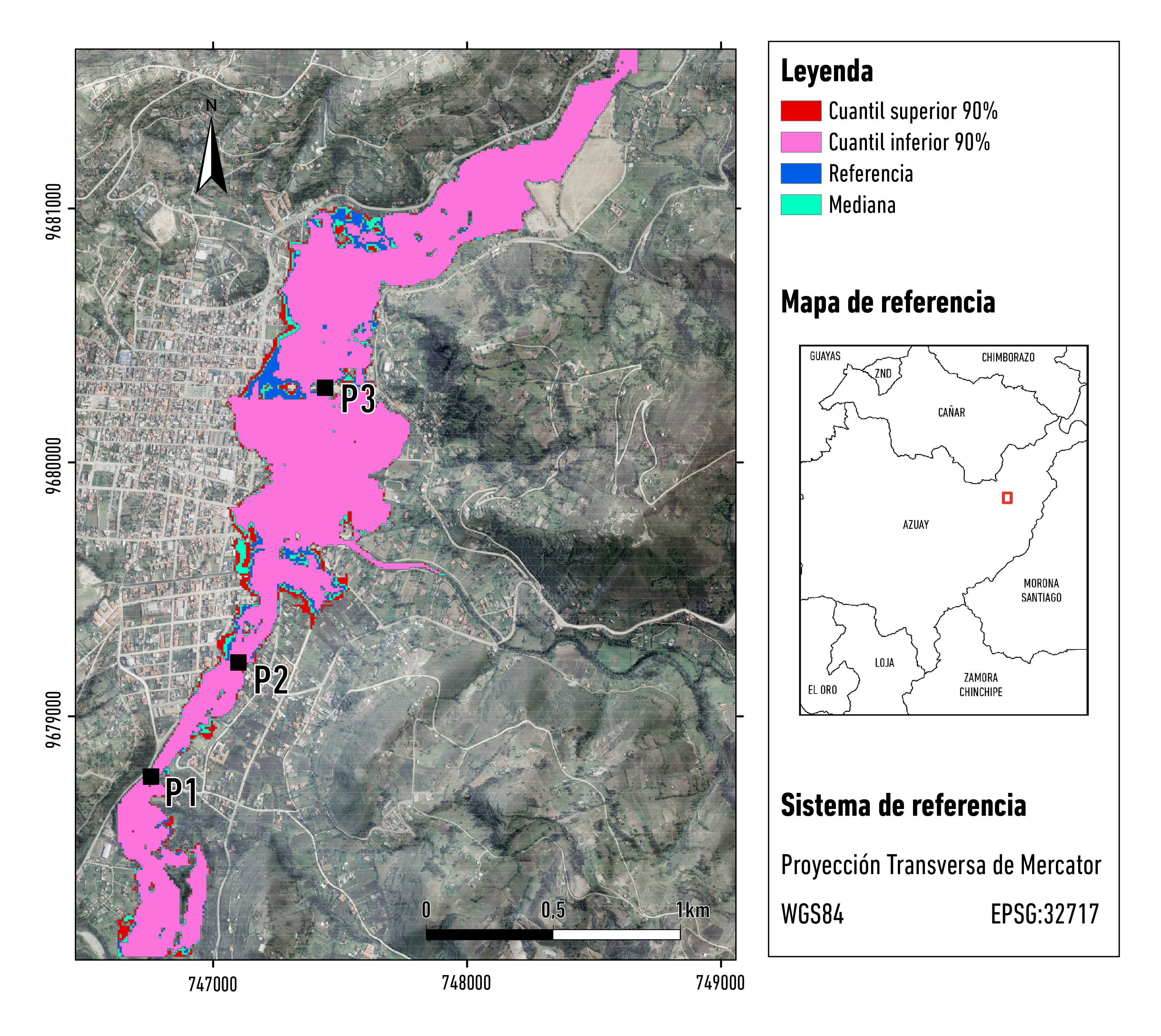 En los mapas de extensión de inundación para los dos eventos evaluados (véase figuras 9 y 10), se observa el mismo patrón espacial y una expansión de la ola de inundación después del segundo puente, lo que probablemente se debe a una topografía más plana localmente. La densificación urbana y el consecuente aumento de la ocupación del suelo podrían incrementar aún más el peligro y riesgo de inundaciones debido al aumento de áreas impermeables que impiden la infiltración (p. ej. viviendas, caminos pavimentados, entre otros) y, por lo tanto, aumentan la escorrentía. Como se aprecia en los mapas de inundación, los cuantiles inferiores están muy cerca de los mapas de referencia, y los mapas de los cuartiles medio (mediana) y superior también son muy similares. Por lo tanto, en este caso específico, una calibración muy detallada y precisa del coeficiente de Manning en el modelo hidráulico no necesariamente proporcionaría mejores resultados en la delimitación del área inundada.