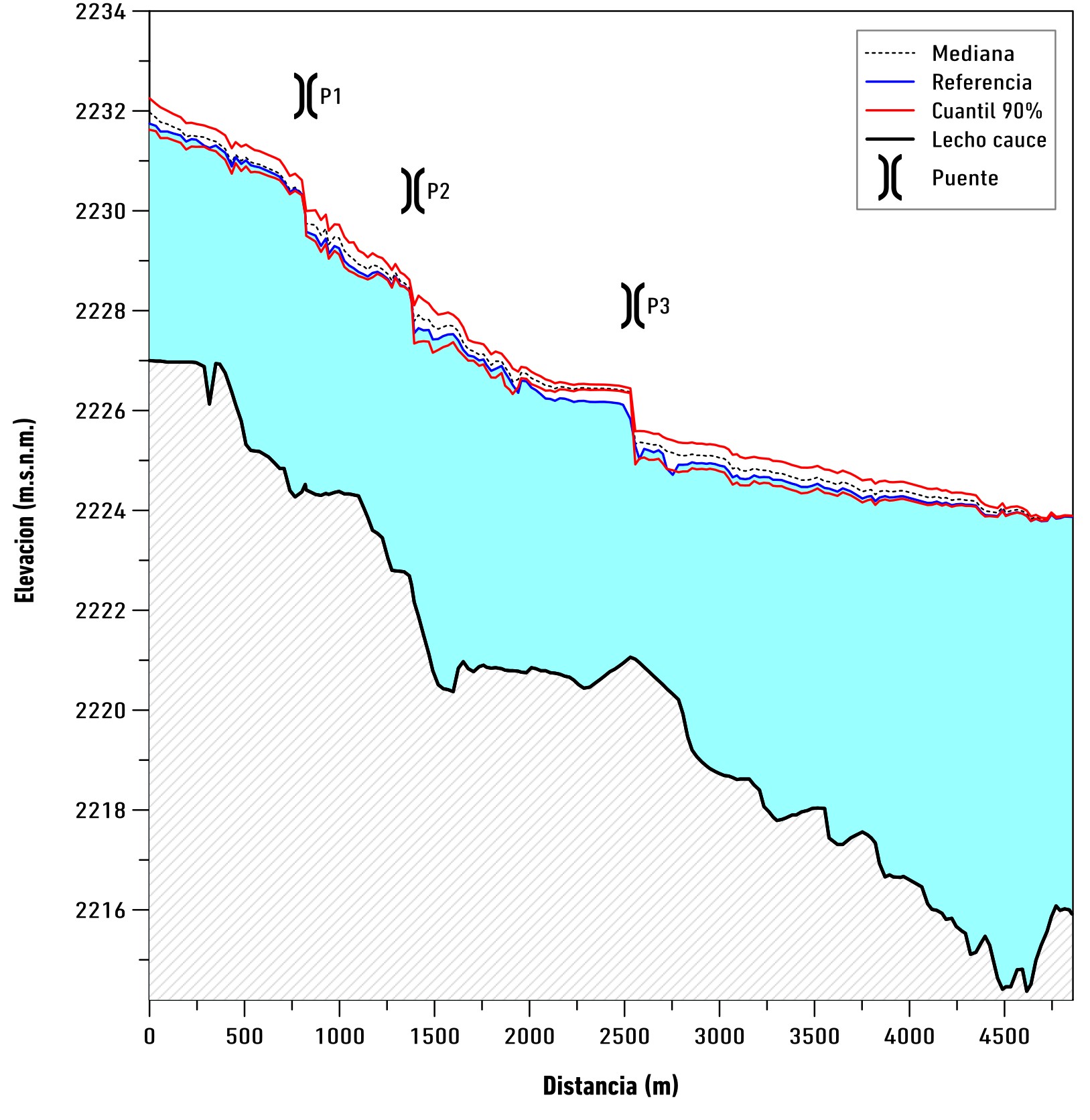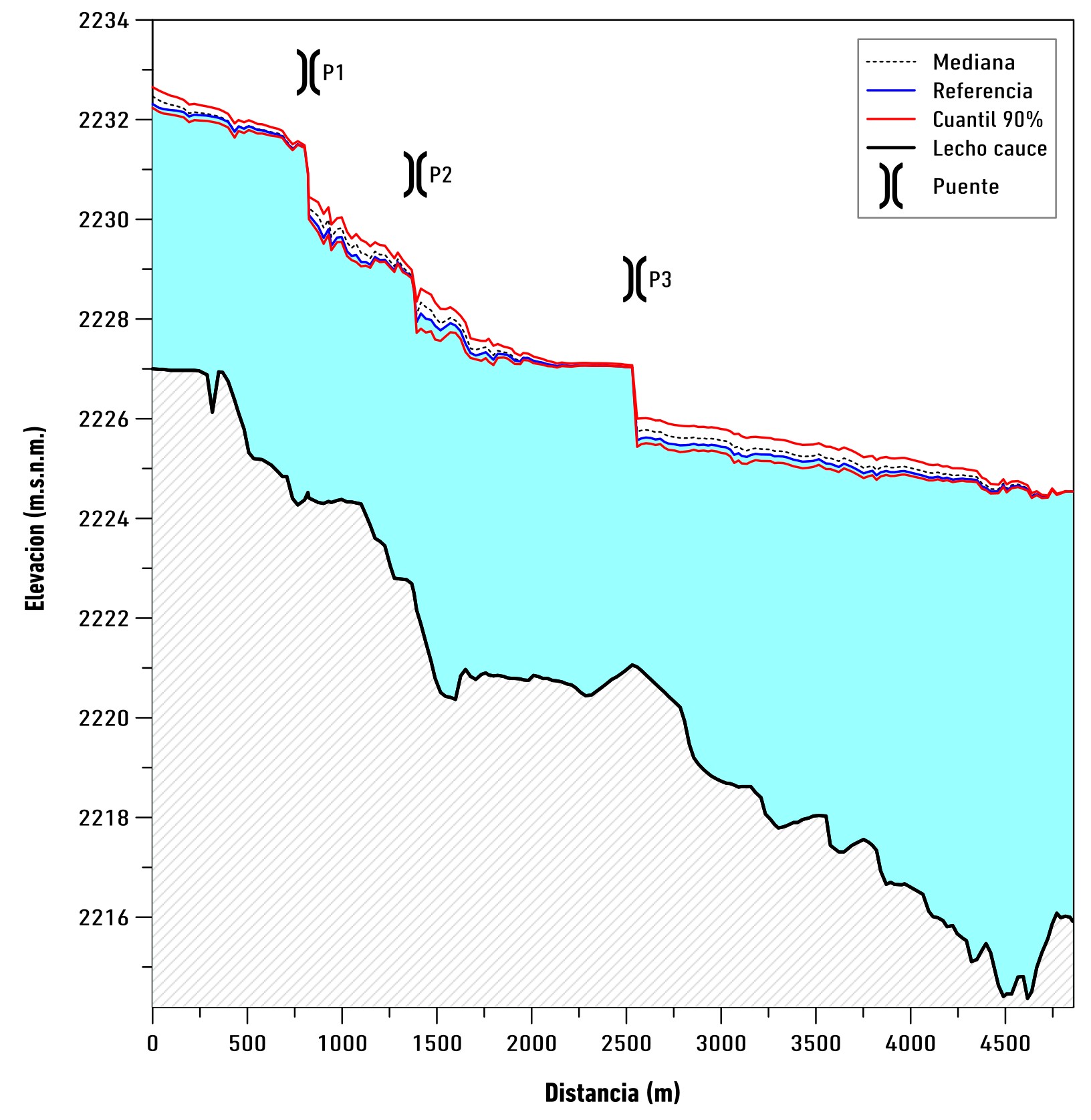 : Niveles de agua superficial en el tramo del río para el evento de inundación de cincuenta años: mediana, referencia, máximo, mínimo y cuantiles del 90% para las seiscientas simulaciones de MC