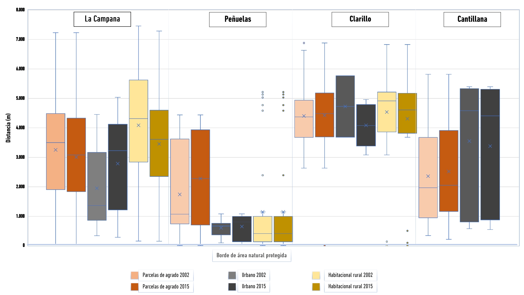 Respecto a la unidad Lago Peñuelas (LP) se encontró que para las parcelas de agrado y habitacional rural, las distancias a la Reserva Nacional Lago Peñuelas no se modificaron; se evidencia también la cercanía de esta cobertura del suelo al borde del área natural protegida, donde se identifica que aproximadamente el 50 % de los datos están distribuidos entre 94 m y 940 m de distancia a este borde para ambos años. Ocurre lo contrario con la cobertura del suelo urbano, la cual obtuvo incrementos considerables en su superficie y donde se identifica una tendencia de acercamiento al ANP, a partir de la disminución de la distancia menor hacia el borde (39 m para el 2015) y del límite inferior donde se localizan aproximadamente el 50 % de los datos. Por lo tanto, en esta unidad la tipología funcional urbana también se localiza en proximidades del ANP.
