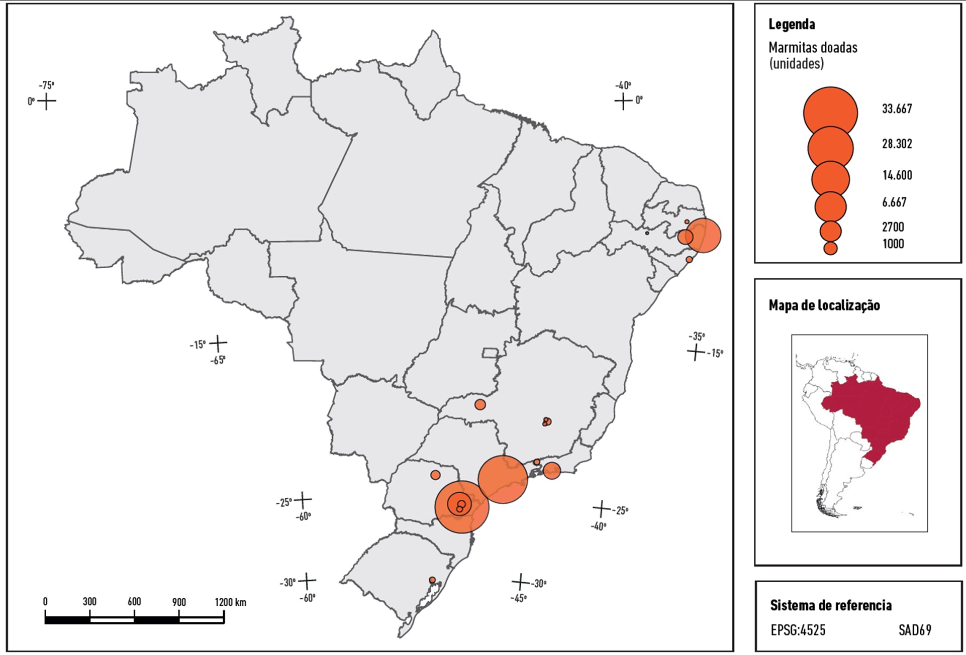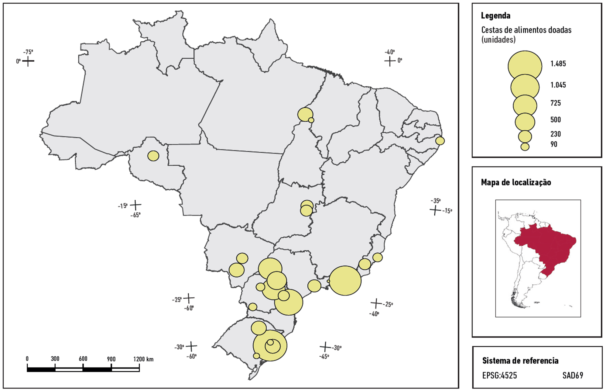 Vale ressaltar que as ações de solidariedade aconteceram em todo o país, mas tiveram uma contribuição maior da região Sul do Brasil, responsável por mais de 50 % das doações de alimentos in natura, quase 45 % das marmitas e 50 % das cestas. A região Nordeste também se destacou na doação de quase 40 % dos alimentos in natura. A região Sudeste foi a segunda maior doadora de marmitas (36 %) e de cestas (35 %). Na Figura 4, na Figura 5 e na Figura 6 são espacializadas as doações de alimentos in natura, cestas e marmitas realizadas em todo o país.