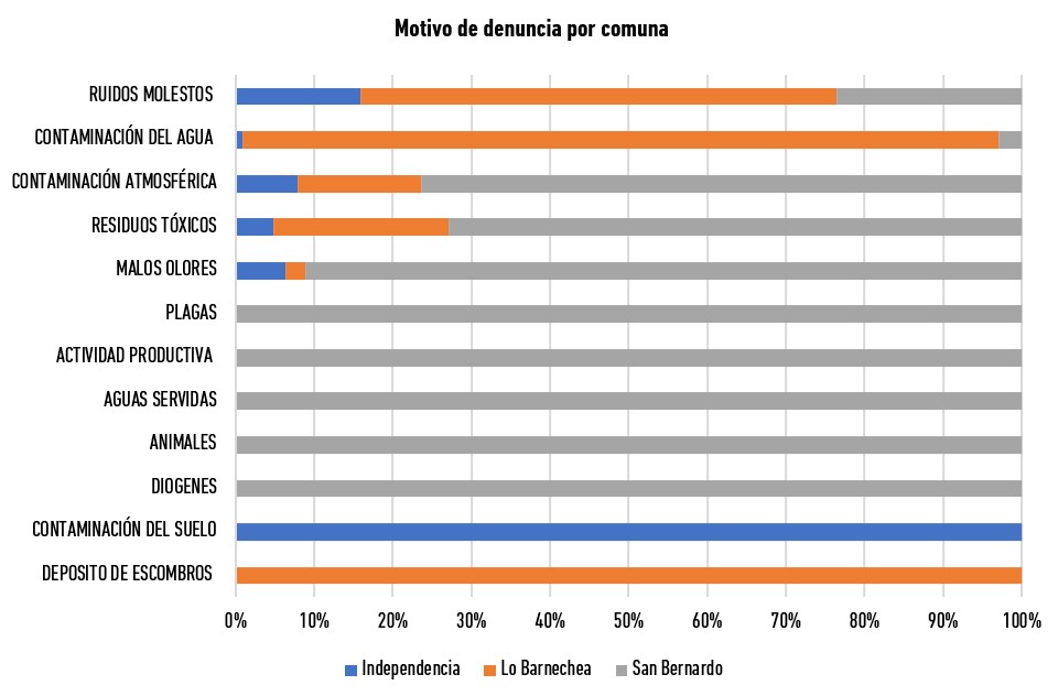 En cuanto a los motivos de las denuncias relativos a cada comuna, en la comuna de Independencia se registraron un 75 % de reclamos debido a ruidos molestos, un 10 % por contaminación del aire, seguido por denuncias debido a contaminación del suelo, malos olores y residuos tóxicos (4 % cada una). En la comuna de Lo Barnechea aparecen un 57 % de reclamos por ruidos molestos, un 35 % de reclamos por contaminación del agua, y un 4 % de reclamos por contaminación atmosférica y residuos tóxicos, respectivamente. Finalmente, en la comuna de San Bernardo se observa un 23 % de reclamos por ruidos molestos, un 19 % de reclamos por contaminación atmosférica, un 14 % de reclamos por residuos tóxicos y plagas, respectivamente, un 13 % de reclamos por malos olores, y un 6 % de reclamos por diversas actividades productivas y aguas servidas, respectivamente. Mientras en una comuna urbana-central como Independencia prima la conflictividad debido al ruido, la comuna periférica-precordillerana de Lo Barnechea presenta un alto porcentaje de denuncias por ruidos molestos, pero también por contaminación de aguas de uso público, en relación con las características geográficas e hidrográficas de la comuna. En cuanto a los denunciados, la comuna de Lo Barnechea posee múltiples denuncias individuales hacia las mismas empresas, siendo estas principalmente constructoras (TECSA, INARCO, IGS), inmobiliarias (Los Robles, Tiziano) y múltiples oficinas, revelando las dinámicas inmobiliarias de esta comuna periurbana y una probable dimensión colectiva. San Bernardo revela denuncias relacionadas con la vocación industrial de la comuna.