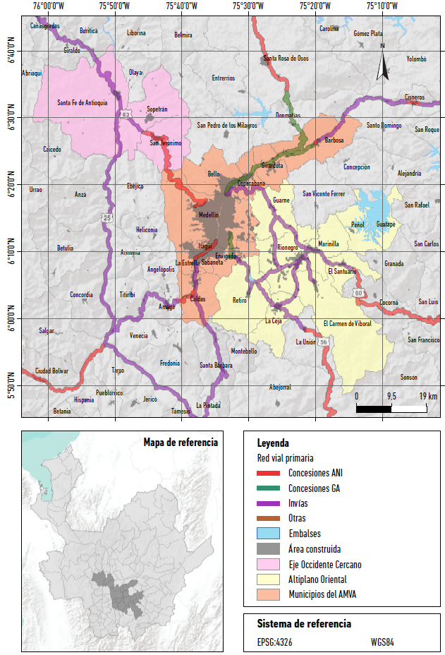 La región metropolitana de Medellín es definida aquí lapso sensu, como una extensión funcionalmente articulada de 3.615 km2, compuesta de 22 municipios antioqueños, que se agrupan en tres áreas diferenciadas (Figura 1): la primera incluye el núcleo urbano principal: Medellín, las fronteras consolidadas de la metropolización del siglo XX, estructurada a partir de la distribución espacial de la industria, sobre diez municipios distribuidos de Sur a Norte que conforman, en términos administrativos, el AMVA; la segunda incluye nueve municipios que giran en torno a la ciudad de Rionegro, emplazados en lo que se conoce como el altiplano del Oriente cercano -en adelante, Oriente- y con funciones ligadas a la industria deslocalizada desde el Valle de Aburrá, la agroindustria (flores) en adyacencias al Aeropuerto Internacional José María Córdova y el comercio (un conjunto creciente de centros comerciales y malls); y finalmente, tres municipios dispuestos a modo de eje, localizados en las estribaciones occidentales de la cordillera central y sobre el valle del río Cauca, vinculados a funciones turísticas, con predominio de residencias secundarias, y foco reciente de migraciones de retiro.