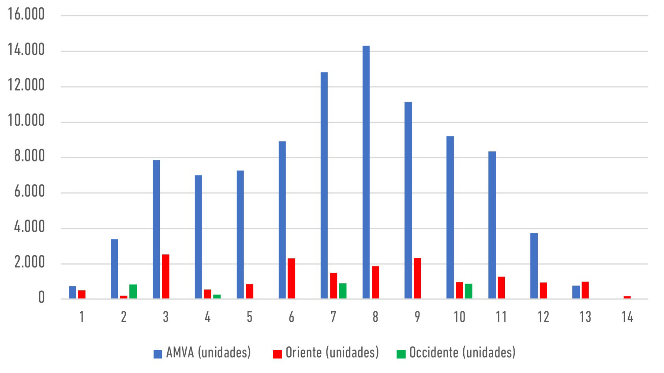 En ese sentido, en la Figura 2 se presentan las unidades habitacionales según año de inicio de la construcción para las tres áreas1: es posible observar una fase ascendente entre 2005 y 2013 en el AMVA y una descendente entre 2014 y 2018, mientras que en Oriente se dio un patrón similar, pero con fase ascendente entre 2007 y 2013 y un periodo de estancamiento relativo entre 2014 y 2018; en Occidente esa fase expansiva fue mucho más intensa, pero solo duró entre 2007 y 2011 (Figura 2), con muy bajos volúmenes entre 2014 y 20162.