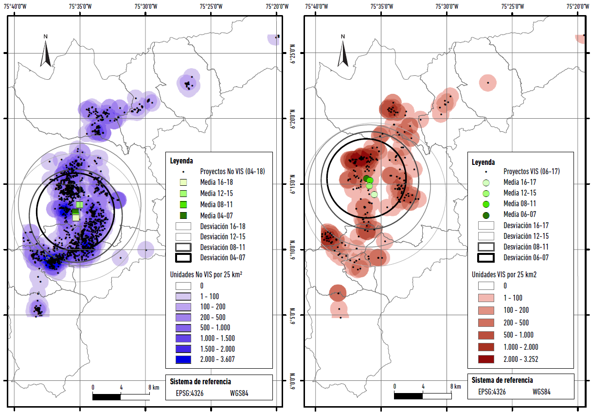 Muestra de ello son los mapas de la Figura 3. En el mapa de la izquierda, se identifica que los conjuntos habitacionales No VIS cuya construcción inició entre 2004 y 2018 en el AMVA, implican tanto la extensión a escala metropolitana de algunos de los patrones de segregación residencial de Medellín como la emergencia de unos nuevos, no asociados con estos. Por ejemplo, el sector centro-occidente y suroriente de la capital, vinculado a estratos medios, medios-altos y altos, se ha extendido en un eje continuo y convergente en sentido centro-sur y suroriente, hacia Itagüí, Envigado, Sabaneta, La Estrella y Caldas, sobre todo en las partes bajas del valle articuladas al sistema de metro. Sin embargo, desde 2012 lo que revela el análisis de dispersión -la desviación estándar espacial según el peso de unidades por conjunto- es una más acelerada difusión al Norte de conjuntos No VIS, principalmente en el municipio de Bello, destinados sobre todo a clases medias.