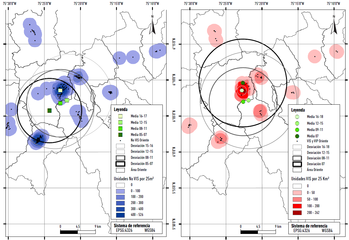 En el eje Occidente las promotoras-constructoras tienden a impulsar mayoritariamente conjuntos habitacionales No VIS, asociados a condominios que corresponden a segundas residencias o viviendas principales de hogares de pensionados, mientras que la producción de VIS es casi inexistente (Figura 5). Lo que indica el mapa de la derecha de la Figura 5 es un proceso de difusión espacial de la producción habitacional en sentido Occidente-Oriente, que tuvo como inicio el municipio de Santa Fe entre 2005 y 2007 y se intensificó entre 2008 y 2015, haciéndose importante, sobre todo, en San Jerónimo entre 2008 y 2011; mientras que entre 2012 y 2015 hubo cierta recentralización de los frentes de inversión hacia Santa Fe, como lo demuestran las medias y desviaciones espaciales.