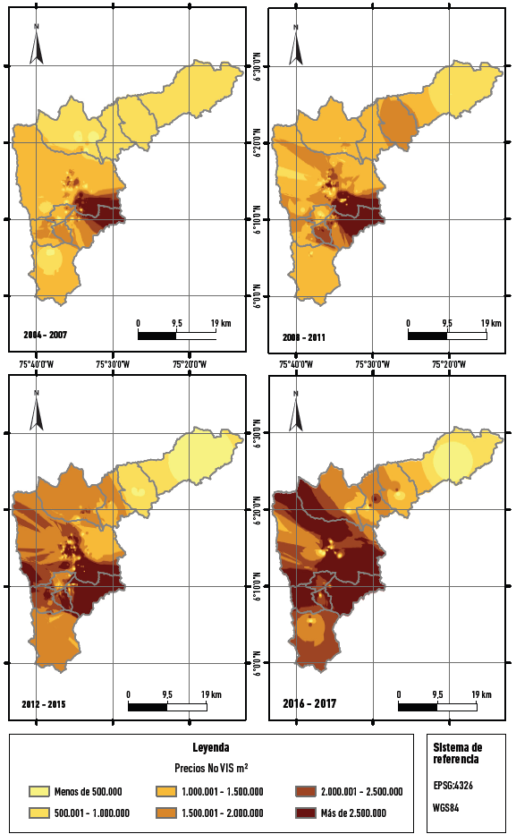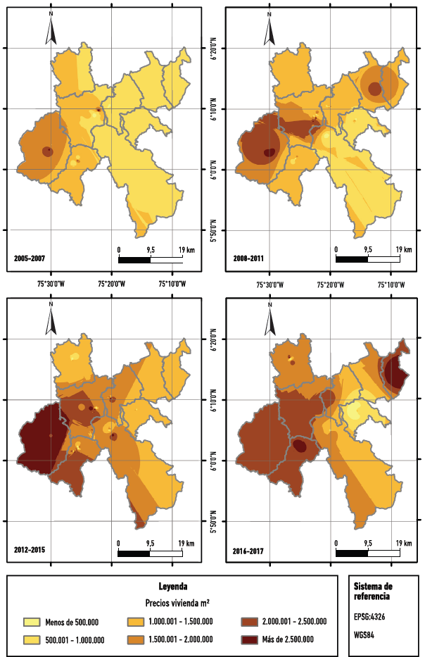 En Oriente la evolución de los precios de las unidades No VIS es bastante similar a la del AMVA. Si bien hay un aumento rápido y considerable entre 2008 y 2017, este fue particularmente intenso entre 2012 y 2015, para atenuarse en términos relativos en los años de 2016 y 2017. De igual manera, el precio promedio de las No VIS entre 2005 y 2007 fue de $1.050.000 pesos por m2, de $1.343.000 entre 2008 y 2011, de $1.764.000 de 2012 a 2015 y, finalmente, de $1.815.000, lo cual representa variaciones entre los distintos periodos de 27,9 %, 31,3 % y 2,9 %, respectivamente. Los mapas de isopletas de la Figura 8 evidencian que, de los núcleos de mayor renta noroccidentales de El Retiro y Rionegro y del turístico municipio de Guatapé al nororiente, se pasó a un aumento muy marcado que afecta toda la zona occidental del altiplano oriental (Retiro, La Ceja, Rionegro) y el extremo oriental, con menores precios de No VIS en el Sur (parte del municipio de Marinilla, Santuario y Carmen de Viboral).