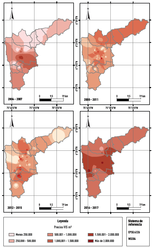 Los precios de la VIS en Oriente reflejan el mismo patrón espacio-temporal que en el AMVA: altísimos aumentos entre los distintos periodos, hasta alcanzar precios por metro cuadrado muy altos en toda el área. En un principio, el precio por metro cuadrado de VIS en Oriente era significativamente más barato que en el AMVA, en promedio de $298.000 entre 2005 y 2007 (contra $538.000), pero rápidamente aumentó 40,9 % para el siguiente periodo 2008-2011, hasta alcanzar los $505.000, y $888.000 entre 2012 y 2015 (75,8 %) y, finalmente, un precio de $1.576.000 entre 2016 y 2017 (77,4 %), muy cercano al de las VIS construidas en el valle de Aburrá. A pesar de que los precios No VIS y VIS en Oriente eran más bajos que en el AMVA entre 2005 y 2007, su crecimiento en todo el periodo fue más intenso: el precio promedio de la primera se multiplicó 1,72 veces y el de las segundas se quintuplicó 5,2 veces, entre esa primera fecha y 2017.