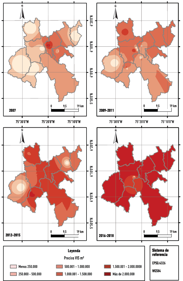 Finalmente, otra forma pertinente para analizar la integración es identificar el otro componente de los ciclos inmobiliarios, además de la producción de nuevas unidades: el precio de las viviendas en los dos segmentos. Para esto se deflactaron los precios reales a valores de 2018 y se construyeron para las distintas fechas y áreas mapas de isopletas a partir de una interpolación de distancia inversa (Inverse Distance Weighting - IDW) que asume una alta y positiva autocorrelación espacial en los precios habitacionales.