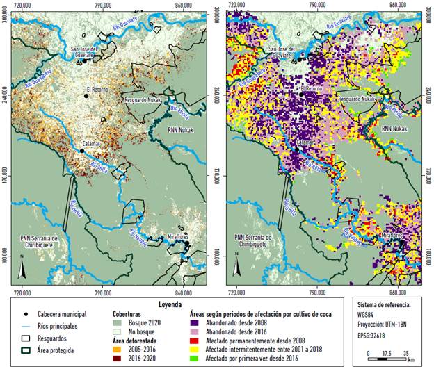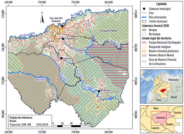 En la actualidad, el 82,5 % del área permanece cubierta por bosque húmedo tropical y abarca una superficie de 36.860,8 km2; de esta un 70 % hace parte de figuras como Parques Nacionales Naturales -en adelante, PNN-, Reservas Nacionales Naturales -en adelante, RNN- y de la Zona de Reserva Forestal de la Amazonía -en adelante, ZRFA-; un 18,8 % pertenece a territorio de resguardos indígenas, mientras que el 11,2 % restante corresponde a la Zona de Reserva Campesina del Guaviare -en adelante, ZRCG-, que abarca tres de las cuatro cabeceras municipales del departamento y desde la cual se expanden los diferentes frentes de deforestación sobre el bosque (Figura 1).