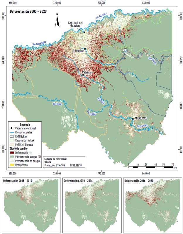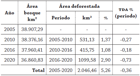 Durante el periodo 2005-2020 el departamento del Guaviare perdió 2.046,46 km2 de bosque, una Tasa de Deforestación Promedio Anual -en adelante, TDA- de -0,36 %. Sin embargo, el comportamiento de la deforestación no fue homogéneo a través del tiempo: del 100 % de la deforestación registrada en 2005-2020, el 26 % ocurrió en 2005-2010, el 20,3 % en 2010-2016, mientras que el 53,7 % restante tuvo lugar en 2016-2020 a una TDA tres veces mayor comparada con las de los intervalos anteriores (Tabla 2). Así, de un promedio de 8.775 ha deforestadas/año entre 2005 y 2016, se pasó a un promedio de 27.489 ha deforestadas/año entre 2016 y 2020.