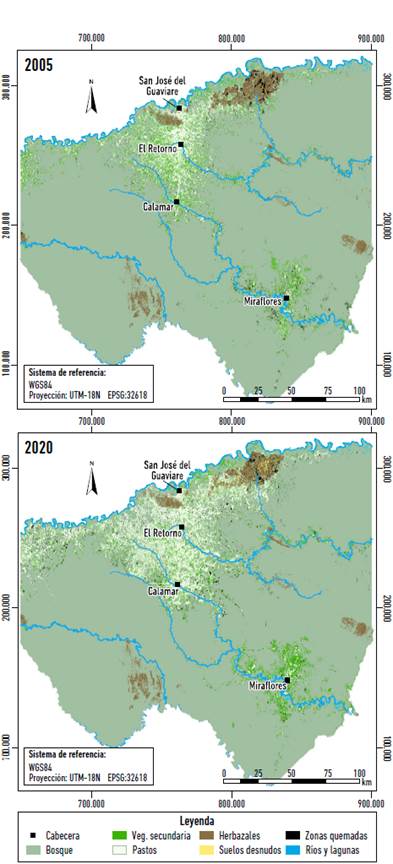 Al combinar los algoritmos Máxima Probabilidad y Clasificación de Firmas de Coberturas Terrestres incorporados en el SCP, se efectuó la clasificación supervisada de los mosaicos y se obtuvieron cuatro mapas de coberturas tipo ráster. Las clases consideradas fueron: bosque denso, pastos sembrados, vegetación secundaria o en transición -agrupa rastrojos y cultivos-, herbazales naturales, zonas quemadas, suelos desnudos, ríos y lagunas. Los puntos de entrenamiento fueron seleccionados con base en interpretación visual de las imágenes y los mapas históricos de cobertura en formato vector a escala 1:100.000 (Sinchi 2020). Obtenidas las clasificaciones finales, se aplicaron filtros para generalizar agrupaciones de pixeles inferiores a % ha y se corrigieron "falsas transiciones" siguiendo el método descrito por Etter et ál. (2006c).