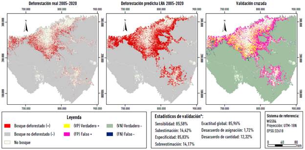 Al cruzar el mapa de deforestación-no deforestación real 2005-2020 con el mapa de deforestación-no deforestación predicha 2005-2020 -según el umbral de clasificación del 61,2 % de probabilidad- se obtuvo una exactitud global del 85,96 % y un error total del 14,04 %. En términos de sensibilidad, el 85,58 % de los pixeles en los que ocurrió realmente deforestación fueron clasificados correctamente como deforestados por el LRA, subestimando el 14,42 % de eventos reales. En términos de especificidad, el 85,83 % de los pixeles en los que no ocurrió realmente deforestación fueron clasificados de forma correcta como no deforestados, sobreestimando deforestación en el 14,17 % restante (Figura 4).