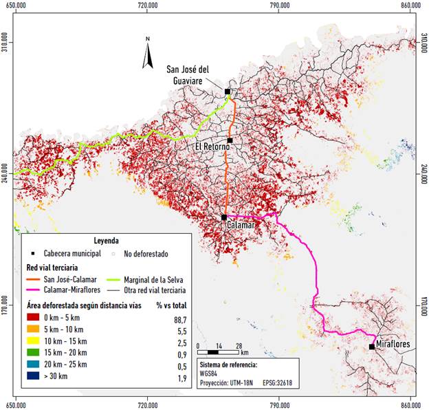 En síntesis, mientras la coca se favorece ante condiciones de relativo aislamiento, ubicándose en áreas accesibles solo por vía fluvial o insipientes sistemas de caminos en la matriz de bosque, la ganadería demanda mayor conexión vial-terrestre con las cabeceras municipales y a través de estas con el interior del país; actualmente el 86 % del ganado en pie del Guaviare tiene como destino las ciudades capitales del interior, principalmente Bogotá (Bravo et ál. 2018). Las vías Marginal de la Selva y Calamar-Miraflores son al respecto dos segmentos críticos ligados a la deforestación actual por ganadería en el área (Rodríguez-de-Francisco et ál. 2021) (véase figura 6).
