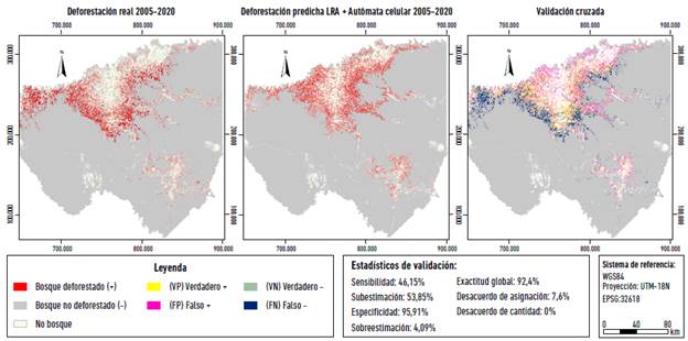 Para validar la precisión de la modelación por autómata celular al asignar el cambio, se creó un mapa alternativo de deforestación-no deforestación predicha 2005-2020 usando como insumo el mapa de probabilidad LRA 2005 y la cantidad de deforestación real observada en 2005-2020. Se cruzó finalmente con el mapa de deforestación-no deforestación real del periodo y se calcularon los indicadores de desacuerdo de cantidad y desacuerdo de asignación.