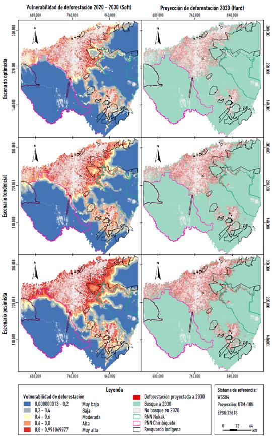 En términos de los escenarios de deforestación construidos, se proyecta la pérdida del 4,4 % del área de bosque (17.295 ha) a 2030 en el escenario optimista, del 6,7 % (262.091 ha) en el tendencial, y del 8,6 % (335.581 ha) en el pesimista. En los tres casos, según los resultados de la simulación soft, el área interior del Resguardo Nukak, el sector norte del PNN Chiribiquete y el área de la ZRFA cercana a las cabeceras municipales y vías terciarias de reciente ampliación serán las más vulnerables a la ocurrencia de deforestación.
