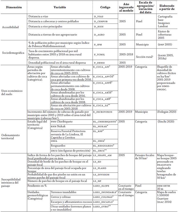 Se consideró un total de 27 variables correspondientes a cinco dimensiones: accesibilidad, características sociodemográficas del área, usos económicos del suelo, ordenamiento del territorio y susceptibilidad intrínseca del paisaje a la deforestación (Tabla 1). Todos los insumos se procesaron en software SIG y se obtuvieron 27 capas ráster remuestreadas a 30 m.