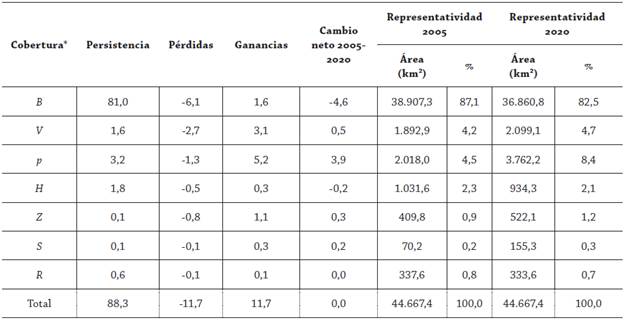 Tabla 3: Representatividad, cambios y permanencias por tipo de cobertura en porcentaje (%) del área de estudio: 2005-2020