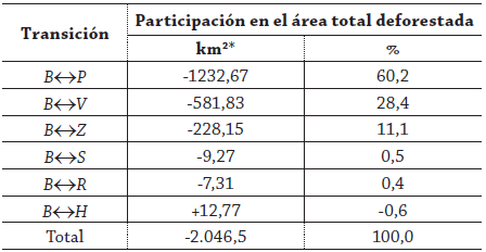 El análisis de los intercambios específicos del bosque frente a las demás coberturas (Tabla 4) reveló que el 60 % de la deforestación registrada se produjo en la transición bosque↔pastos, el 28,4 % en la transición bosque↔vegetación secundaria y el 11,1 % en la transición bosque↔zonas quemadas. Cabe decir que las dos últimas suelen ser etapas intermedias del proceso de conversión del bosque a pasturas. Las demás transiciones por su parte aportaron en menos del 1 % al área total deforestada.