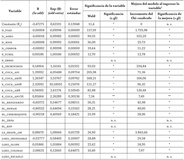 La evaluación de la bondad de ajuste o utilidad general del modelo para explicar la deforestación observada en el periodo 2005-2020 se realizó con base en el cambio en el estadístico -2LL o prueba Chi-Cuadrado de coeficientes del modelo y el R 2 de Nagelkerke (Álvarez-Cáceres 1995; ReStore 2011). La significancia específica de cada variable para explicar el fenómeno fue evaluada de acuerdo con el Test de Wald (Álvarez-Cáceres 1995); así mismo, se validó con investigación en campo la relación entre la variable y el fenómeno descrita por el modelo.