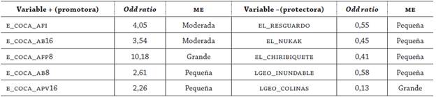 En el caso de la variable áreas según periodos de afectación por cultivos de coca, todas las categorías presentaron relación positiva con el fenómeno incrementando su probabilidad de ocurrencia. Comparado con la categoría áreas sin afectación por cultivos de coca en 2001-2018 (dummy de contraste), la razón de ocurrencia de deforestación es 10,2 veces mayor en áreas afectadas permanentemente desde 2008 (ME Grande-promotora), 4,1 veces mayor en áreas afectadas de forma intermitente en 2001-2018 (ME moderadapromotora), 3,5 veces mayor en áreas abandonadas por los cultivos de coca desde 2016 (ME moderada-promotora), 2,2 veces mayor en áreas afectadas por primera vez desde 2016 (ME pequeña-promotora) y 2,6 veces mayor en áreas abandonadas desde 2008 (ME pequeña-promotora) (Figura 7).