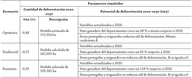 Por último en el escenario pesimista, el ritmo de crecimiento de la TDA se acelera hasta alcanzar el -0,95 % anual, lo que genera la pérdida de 35.558 ha promedio/ año en 2020-2030. El hato ganadero crece en torno a 615.000 cabezas o menos, mientras que las áreas protegidas PNN Chiribiquete, RNN Nukak y los resguardos no contribuyen efectivamente a reducir la ocurrencia de deforestación. Los factores detonantes de cambio profundizan su efecto, sin estrategias de contención efectivas.