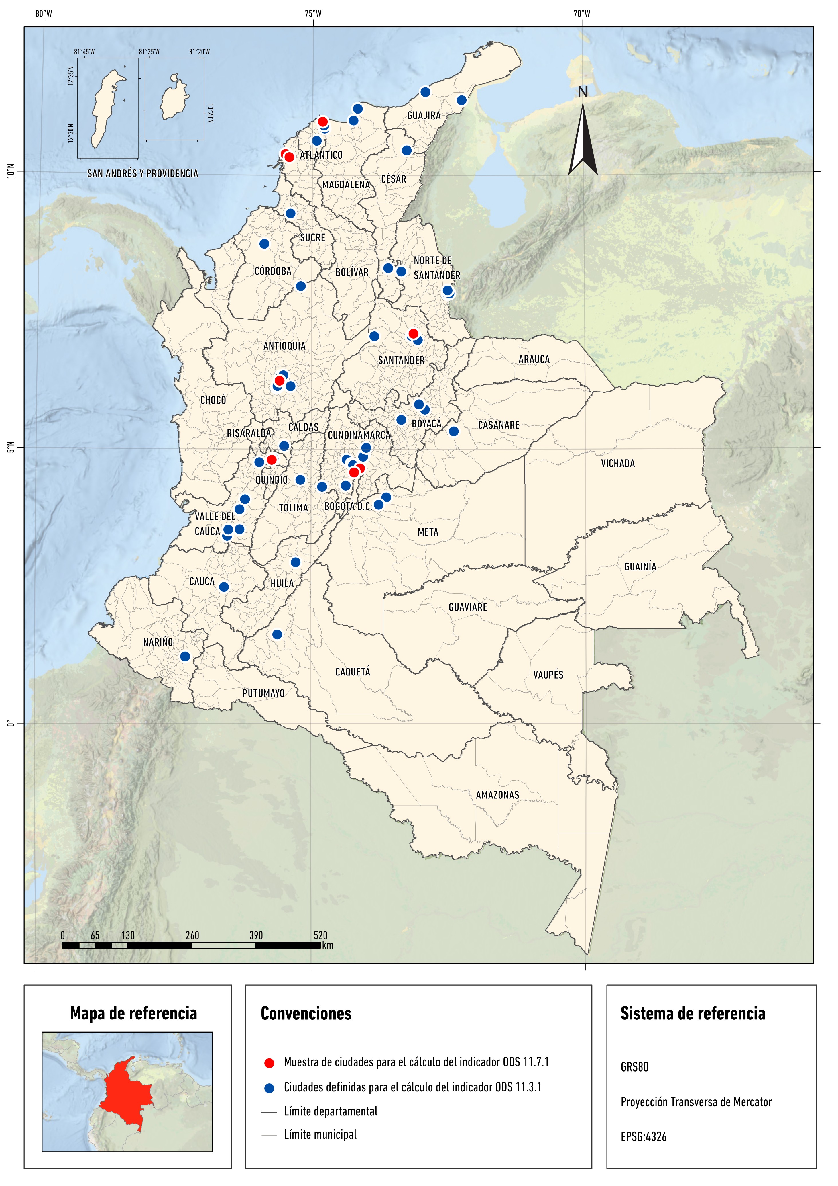 A partir de la metodología DEGURBA se definió un universo de 68 ciudades en Colombia, de las cuales 63 contaban con insumos idóneos (imágenes ópticas sin alta nubosidad) para realizar el cálculo del indicador ODS 11.3.1, en el periodo 2015-2020. A su vez, ya que el indicador 11.7.1 requiere contar con insumos adicionales para determinar espacios abiertos de uso público, los cuales no están disponibles para todas las ciudades, se optó por aplicar el enfoque de una muestra nacional de ciudades del Observatorio Global Urbano —en adelante GUO, por sus siglas en inglés—, a partir de criterios definidos, como el número de ciudades y tamaño de la población, con el fin de usar una muestra estadísticamente representativa de los asentamientos urbanos del país, y así realizar la estimación nacional del indicador (Ndugwa 2018). De acuerdo con lo anterior, se definió una muestra representativa de nueve ciudades para realizar el cálculo del indicador 11.7.1, año 2018, correspondiente a los datos disponibles del Censo Nacional y Población y Vivienda —en adelante, CNPV— de 2018. La Tabla 1 lista las ciudades empleadas para cada uno de los indicadores.