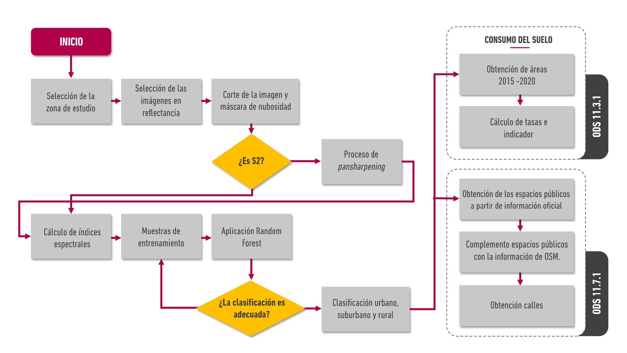 Para el cálculo del indicador ODS 11.3.1 se adopta una métrica espacial como una de sus principales unidades de análisis, la tasa en que el suelo es consumido para crecimiento urbano (GUO 2020) y para ello, un conjunto de datos que sirve como línea base para su cálculo es la capa de asentamientos globales humanos —en adelante GHSL, por sus siglas en inglés— y sus componentes asociados a las áreas construidas, población residente y tipologías de asentamientos (Melchiorri et ál. 2019). Asimismo, el análisis geoespacial combinando datos de población y coberturas del suelo derivan en métricas relevantes para el desarrollo metodológico del indicador (UN-GGIM: Europa 2019b). De esta forma, el empleo de imágenes satelitales como Landsat-8, Sentinel-2 y MODIS, permite monitorear el crecimiento urbano y modelar la expansión de las ciudades, en conjunto al uso de técnicas Machine Learning para la detección de áreas construidas por medio de métodos de clasificación supervisada como las Máquinas de Soporte Vectorial (SVM, por sus siglas en inglés), Random Forest y árboles de decisión (O’Connor et ál. 2020), con las que se busca categorizar grandes números de observaciones, tales como, píxeles de las imágenes (Holloway, Mengersen, y Helmstedt 2018).