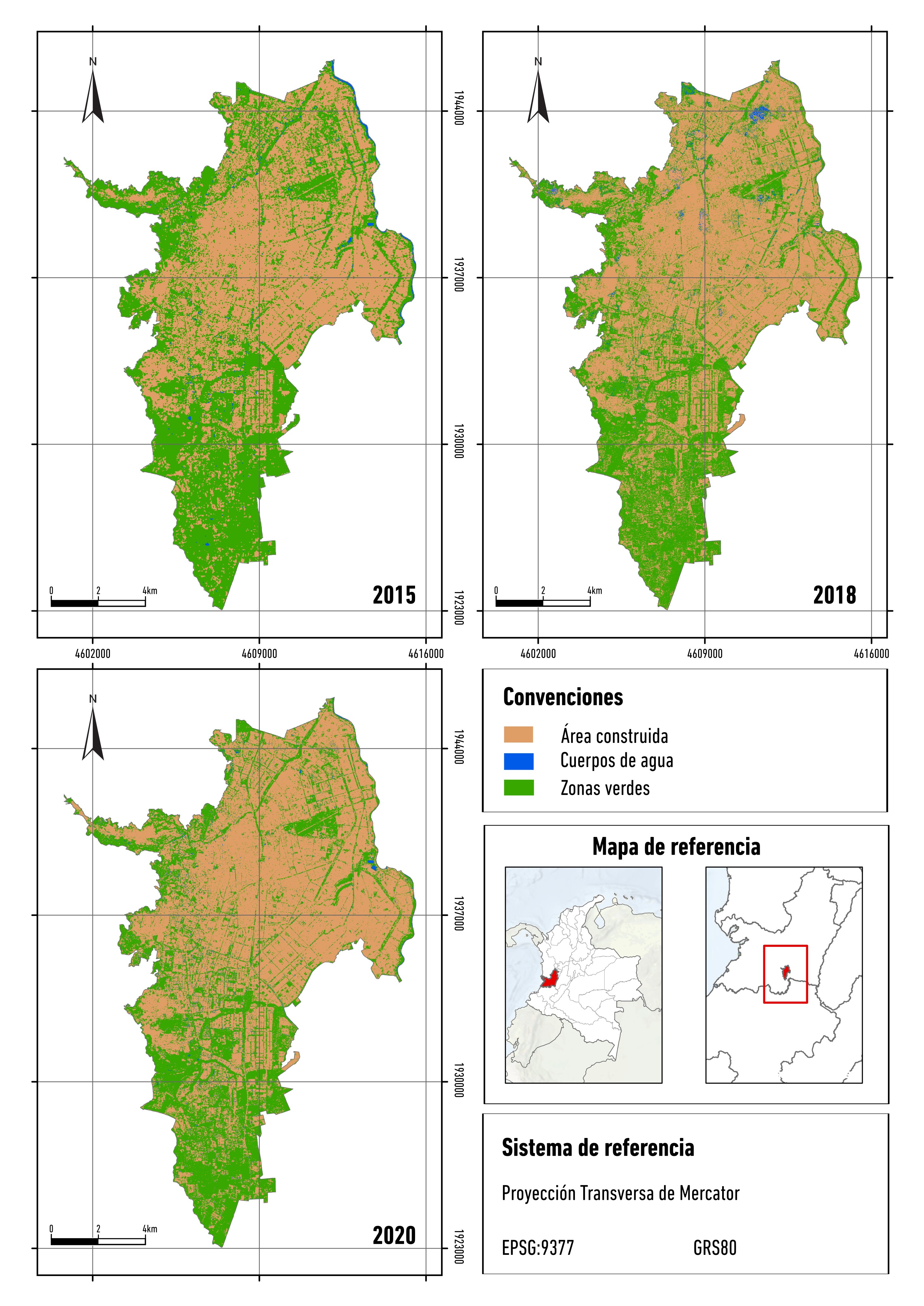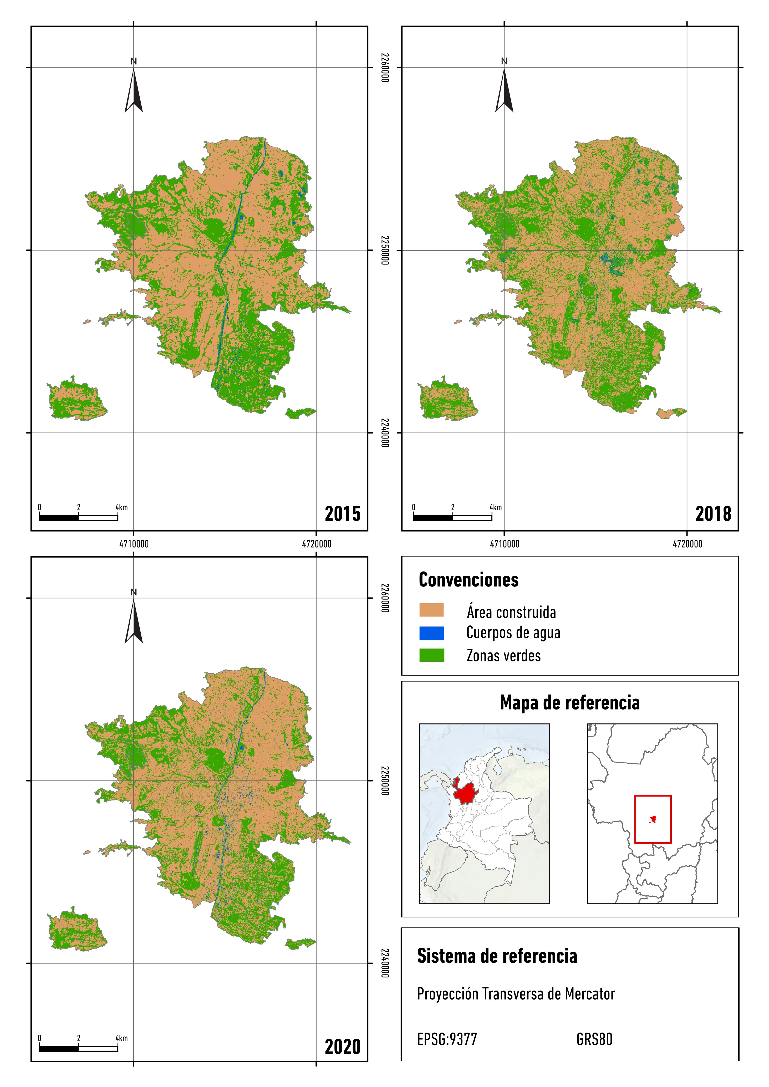 De acuerdo con lo anterior, ante el compromiso de Colombia para la implementación y monitoreo de la Agenda 2030, donde el Departamento Administrativo Nacional de Estadística —en adelante, DANE— participa activamente en el IAEG-SDGs (UNFPA, DANE, y FAO 2021), este trabajo se encamina a resaltar el uso de técnicas enmarcadas en el aprendizaje de máquinas, para el cálculo de los indicadores ODS 11.3.1, relación entre la tasa de consumo del suelo y la tasa de crecimiento de la población, y 11.7.1, proporción media de la superficie edificada de las ciudades que se dedica a espacios abiertos para uso público de todos, en un marco de procesos enfocados en la integración de la información estadística y geoespacial, a partir de los datos proporcionados por el DANE, en conjunción al acceso y procesamiento de imágenes de satélite. Otro aspecto relevante que se deriva de la realización de estos cálculos es lograr que Colombia escale posiciones en el índice ODS para América Latina y el Caribe, que para 2019 posicionaba al país en el puesto noveno del ranking regional (CODS 2020).