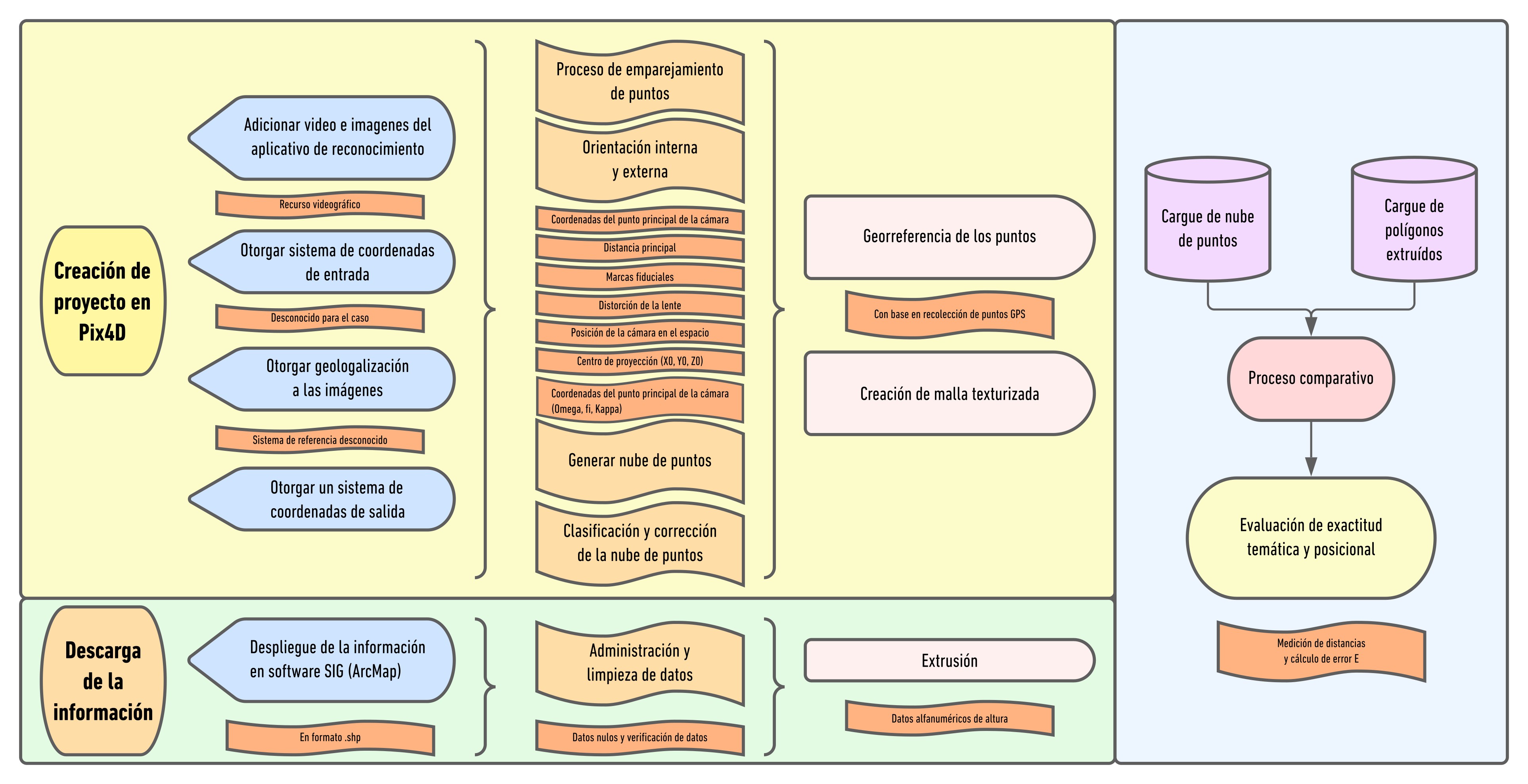 El flujo de trabajo comprende tres escenarios. El primero es la creación y ejecución de la metodología en el software fotogramétrico Pix4D, comprendido por la adición del recurso videográfico, el diligenciamiento de los sistemas de referencia que, para este caso, comprende la opción desconocido. Posteriormente se tiene el proceso de emparejamiento de puntos, la orientación interna (cuyos atributos comprenden las coordenadas del punto principal de la cámara, distancia principal, distorsión de la lente) y orientación externa (cuyos atributos comprenden la posición de la cámara en el espacio, el centro de proyección (X0, Y0, Z0) y los tres giros de la cámara Omega, Phi, Kappa). Ahora, una vez se realizan dichas orientaciones, se genera la nube de puntos, se clasifica y se hace el proceso de corrección temática y posicional de la nube, finalmente, se lleva el proceso de georreferenciación de los puntos con base en puntos de control terrestre tomados con GPS, utilizando un sistema de referencia proyectado (Único origen nacional) y la creación de la malla texturizada.