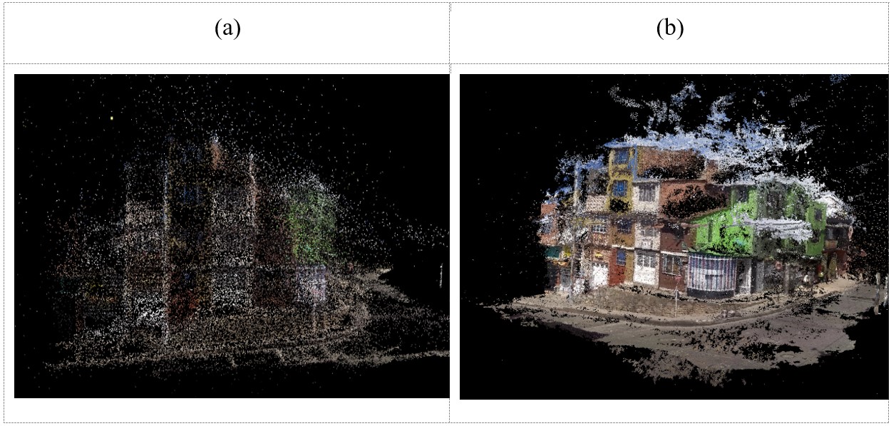 En relación con los tiempos de procesamiento, la densificación de la nube de puntos tuvo una duración de dieciocho minutos y ocho segundos, mientras que la generación de la malla texturizada 3D tuvo una duración aproximada de cinco minutos y cincuenta y cinco segundos. Hay que tener en cuenta que estos tiempos no incluyen el tiempo de clasificación dado por el fotointerpretador, que varía según la dificultad y el número de puntos densificados. Sobre los resultados cualitativos, la Figura 3 muestra tanto la nube de puntos dispersa (a) como la nube de puntos densa (b).